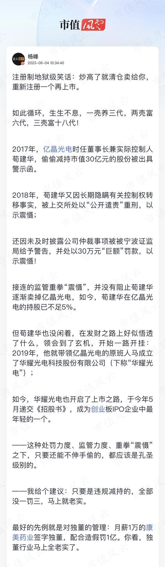 处罚不严,欲壑难填!套现29亿,罚款30万,荀建华家族导演注册制地狱级笑话:华耀光电,必将重演亿晶光电(维权)的所有套路