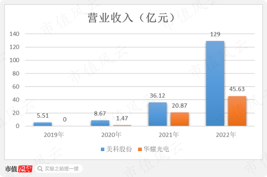 从最直接的业绩入手,2022年,华耀光电实现营收45.63亿,较2021年增长118.67%,较2020年增长超30倍,整体增势与美科股份相差不大。