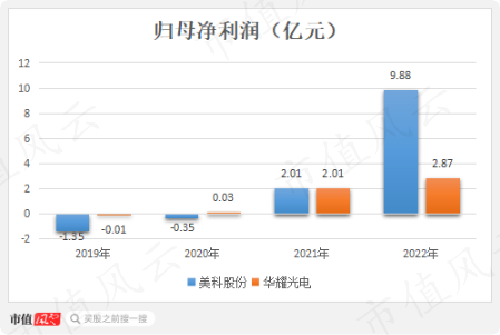 利润方面也大差不差,2022年,华耀光电归母净利润2.87亿,较美科股份差了两倍有余。