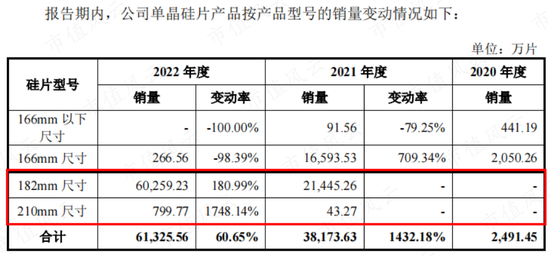 2022年,其166mm及以下尺寸单晶硅片销量占比已降至0.43%,182mm和210mm大尺寸单晶硅片的产品销量占比已达到99.57%。
