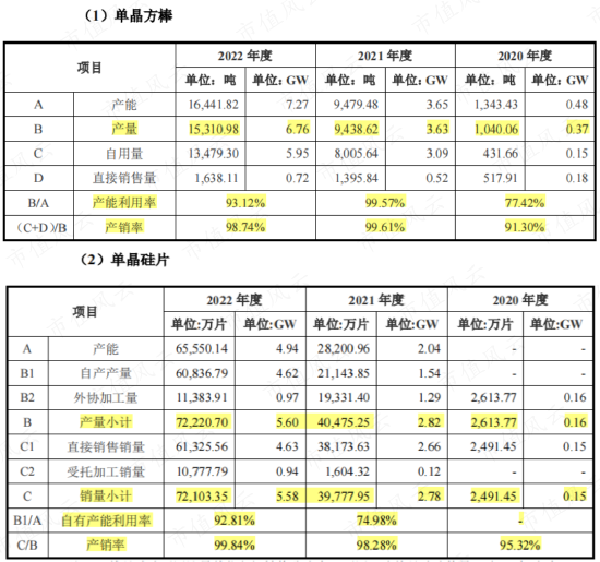 随着光伏行业的高景气,华耀光电硅棒和硅片的产量、销量一路上行,产能利用率和产销率基本维持高位,2022年近乎满产满销。