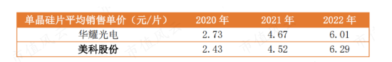 两家公司均从中受益。华耀光电的单晶硅片平均售价,从2020年的2.73元/片涨至2022年的6.01元/片,涨幅达120%;美科股份的销售单价则从2.43元/片涨至6.29元/片,涨幅达158%。